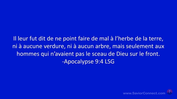 Il leur fut dit de ne point faire de mal à l'herbe de la terre, ni à aucune verdure, ni à aucun arbre, mais seulement aux hommes qui n'avaient pas le sceau de Dieu sur le front. -Apocalypse 9:4 LSG