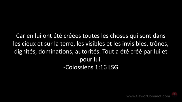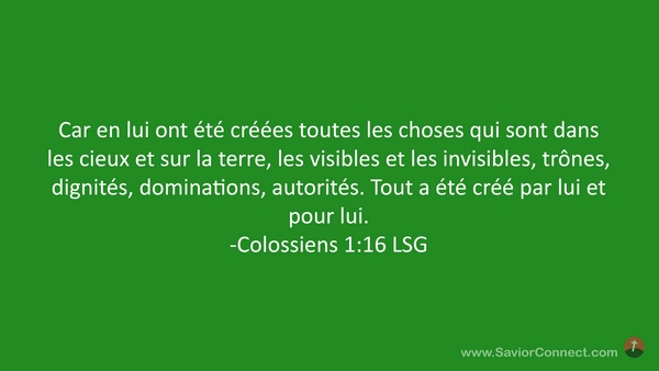 Car en lui ont été créées toutes les choses qui sont dans les cieux et sur la terre, les visibles et les invisibles, trônes, dignités, dominations, autorités. Tout a été créé par lui et pour lui. -Colossiens 1:16 LSG