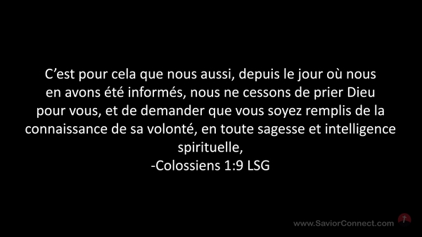 C'est pour cela que nous aussi, depuis le jour où nous en avons été informés, nous ne cessons de prier Dieu pour vous, et de demander que vous soyez remplis de la connaissance de sa volonté, en toute sagesse et intelligence spirituelle, -Colossiens 1:9 LSG
