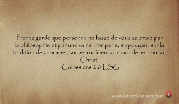 Prenez garde que personne ne fasse de vous sa proie par la philosophie et par une vaine tromperie, s'appuyant sur la tradition des hommes, sur les rudiments du monde, et non sur Christ. -Colossiens 2:8 LSG