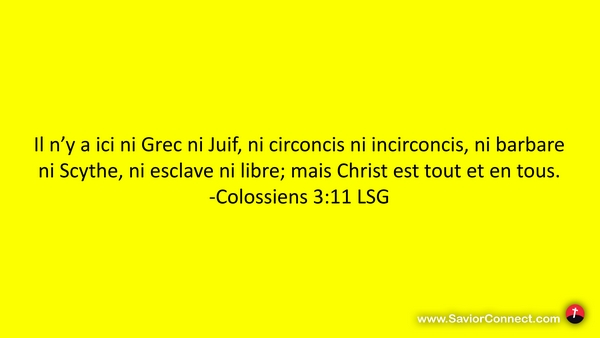 Il n'y a ici ni Grec ni Juif, ni circoncis ni incirconcis, ni barbare ni Scythe, ni esclave ni libre; mais Christ est tout et en tous. -Colossiens 3:11 LSG