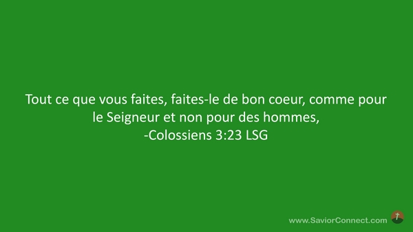 Tout ce que vous faites, faites-le de bon coeur, comme pour le Seigneur et non pour des hommes, -Colossiens 3:23 LSG