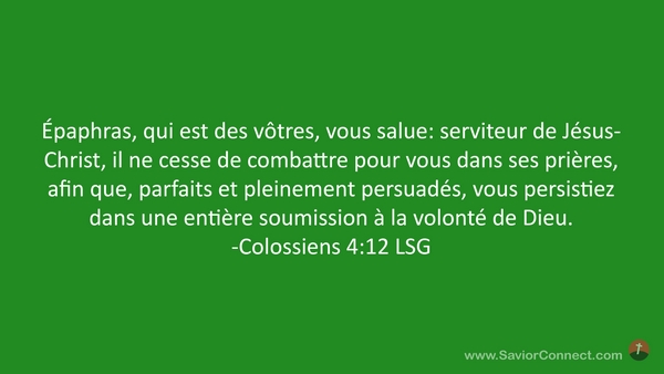 Épaphras, qui est des vôtres, vous salue: serviteur de Jésus-Christ, il ne cesse de combattre pour vous dans ses prières, afin que, parfaits et pleinement persuadés, vous persistiez dans une entière soumission à la volonté de Dieu. -Colossiens 4:12 LSG