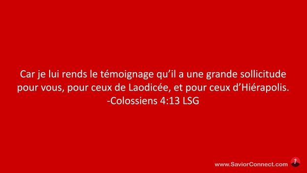 Car je lui rends le témoignage qu'il a une grande sollicitude pour vous, pour ceux de Laodicée, et pour ceux d'Hiérapolis. -Colossiens 4:13 LSG