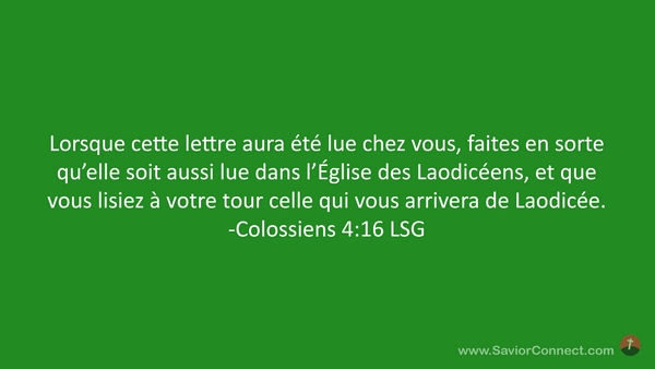 Lorsque cette lettre aura été lue chez vous, faites en sorte qu'elle soit aussi lue dans l'Église des Laodicéens, et que vous lisiez à votre tour celle qui vous arrivera de Laodicée. -Colossiens 4:16 LSG