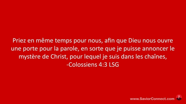 Priez en même temps pour nous, afin que Dieu nous ouvre une porte pour la parole, en sorte que je puisse annoncer le mystère de Christ, pour lequel je suis dans les chaînes, -Colossiens 4:3 LSG