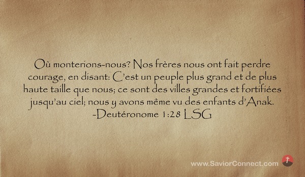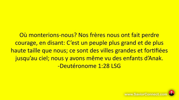 Où monterions-nous? Nos frères nous ont fait perdre courage, en disant: C'est un peuple plus grand et de plus haute taille que nous; ce sont des villes grandes et fortifiées jusqu'au ciel; nous y avons même vu des enfants d'Anak. -Deutéronome 1:28 LSG