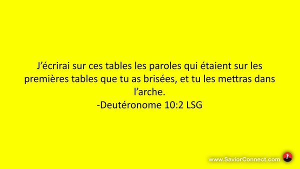 J'écrirai sur ces tables les paroles qui étaient sur les premières tables que tu as brisées, et tu les mettras dans l'arche. -Deutéronome 10:2 LSG