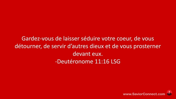 Gardez-vous de laisser séduire votre coeur, de vous détourner, de servir d'autres dieux et de vous prosterner devant eux. -Deutéronome 11:16 LSG