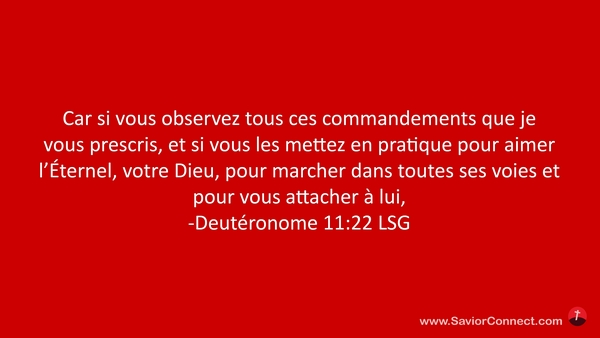 Car si vous observez tous ces commandements que je vous prescris, et si vous les mettez en pratique pour aimer l'Éternel, votre Dieu, pour marcher dans toutes ses voies et pour vous attacher à lui, -Deutéronome 11:22 LSG