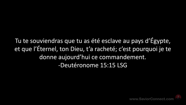 Tu te souviendras que tu as été esclave au pays d'Égypte, et que l'Éternel, ton Dieu, t'a racheté; c'est pourquoi je te donne aujourd'hui ce commandement. -Deutéronome 15:15 LSG