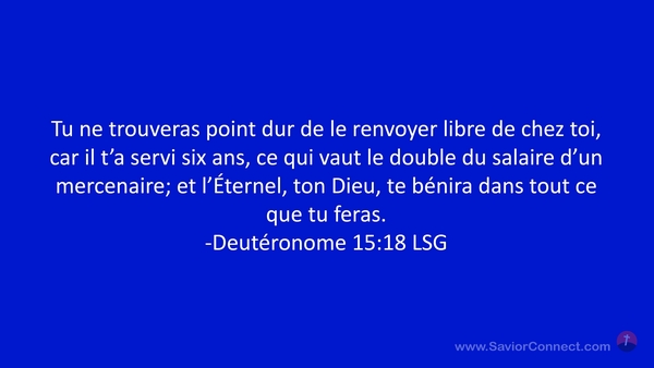 Tu ne trouveras point dur de le renvoyer libre de chez toi, car il t'a servi six ans, ce qui vaut le double du salaire d'un mercenaire; et l'Éternel, ton Dieu, te bénira dans tout ce que tu feras. -Deutéronome 15:18 LSG