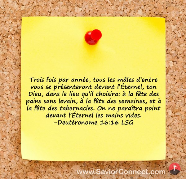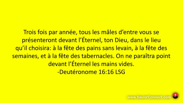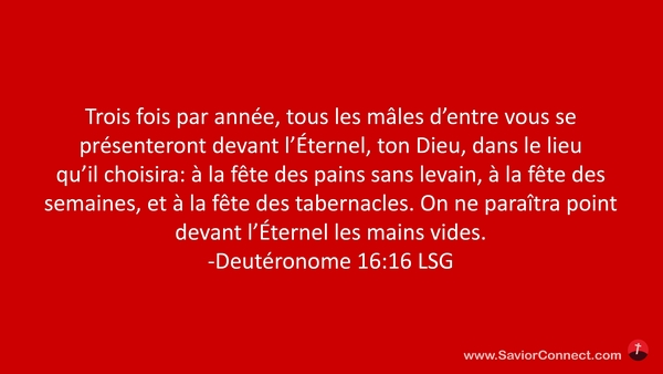 Trois fois par année, tous les mâles d'entre vous se présenteront devant l'Éternel, ton Dieu, dans le lieu qu'il choisira: à la fête des pains sans levain, à la fête des semaines, et à la fête des tabernacles. On ne paraîtra point devant l'Éternel les mains vides. -Deutéronome 16:16 LSG