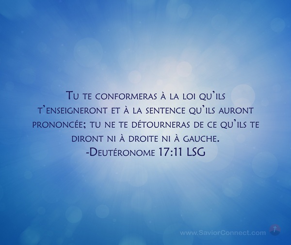 Tu te conformeras à la loi qu'ils t'enseigneront et à la sentence qu'ils auront prononcée; tu ne te détourneras de ce qu'ils te diront ni à droite ni à gauche. -Deutéronome 17:11 LSG