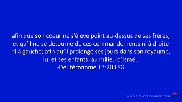 afin que son coeur ne s'élève point au-dessus de ses frères, et qu'il ne se détourne de ces commandements ni à droite ni à gauche; afin qu'il prolonge ses jours dans son royaume, lui et ses enfants, au milieu d'Israël. -Deutéronome 17:20 LSG