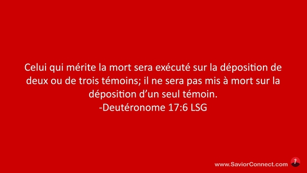 Celui qui mérite la mort sera exécuté sur la déposition de deux ou de trois témoins; il ne sera pas mis à mort sur la déposition d'un seul témoin. -Deutéronome 17:6 LSG
