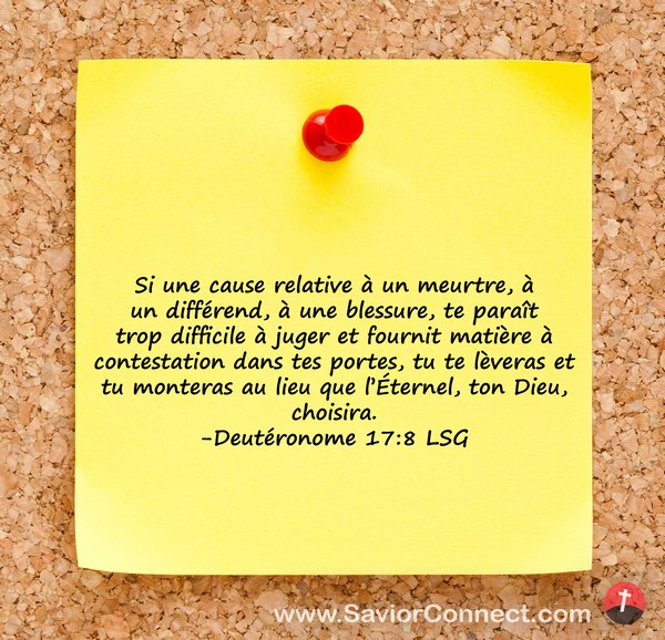 Si une cause relative à un meurtre, à un différend, à une blessure, te paraît trop difficile à juger et fournit matière à contestation dans tes portes, tu te lèveras et tu monteras au lieu que l'Éternel, ton Dieu, choisira. -Deutéronome 17:8 LSG