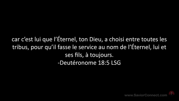 car c'est lui que l'Éternel, ton Dieu, a choisi entre toutes les tribus, pour qu'il fasse le service au nom de l'Éternel, lui et ses fils, à toujours. -Deutéronome 18:5 LSG