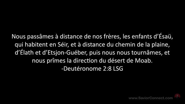 Nous passâmes à distance de nos frères, les enfants d'Ésaü, qui habitent en Séir, et à distance du chemin de la plaine, d'Élath et d'Etsjon-Guéber, puis nous nous tournâmes, et nous prîmes la direction du désert de Moab. -Deutéronome 2:8 LSG
