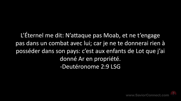 L'Éternel me dit: N'attaque pas Moab, et ne t'engage pas dans un combat avec lui; car je ne te donnerai rien à posséder dans son pays: c'est aux enfants de Lot que j'ai donné Ar en propriété. -Deutéronome 2:9 LSG