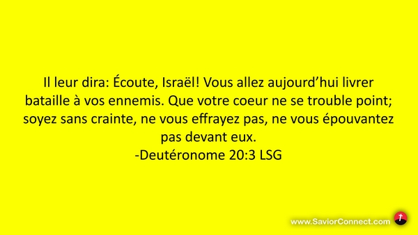 Il leur dira: Écoute, Israël! Vous allez aujourd'hui livrer bataille à vos ennemis. Que votre coeur ne se trouble point; soyez sans crainte, ne vous effrayez pas, ne vous épouvantez pas devant eux. -Deutéronome 20:3 LSG