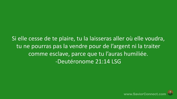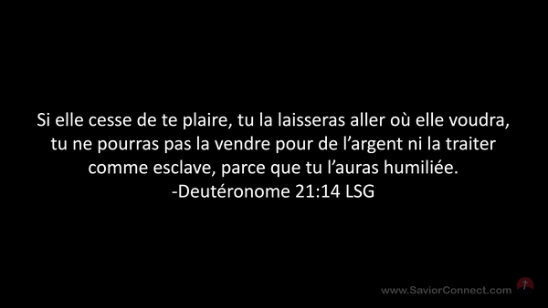 Si elle cesse de te plaire, tu la laisseras aller où elle voudra, tu ne pourras pas la vendre pour de l'argent ni la traiter comme esclave, parce que tu l'auras humiliée. -Deutéronome 21:14 LSG