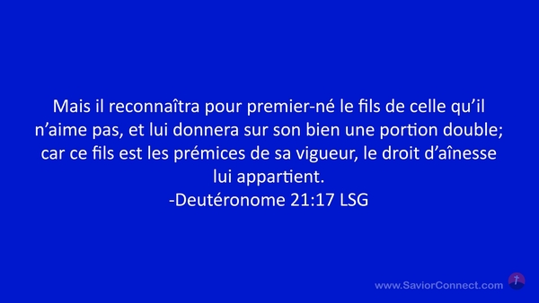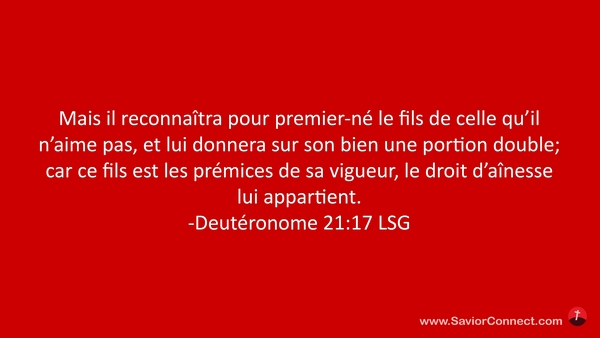 Mais il reconnaîtra pour premier-né le fils de celle qu'il n'aime pas, et lui donnera sur son bien une portion double; car ce fils est les prémices de sa vigueur, le droit d'aînesse lui appartient. -Deutéronome 21:17 LSG