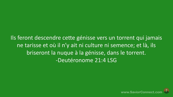Ils feront descendre cette génisse vers un torrent qui jamais ne tarisse et où il n'y ait ni culture ni semence; et là, ils briseront la nuque à la génisse, dans le torrent. -Deutéronome 21:4 LSG