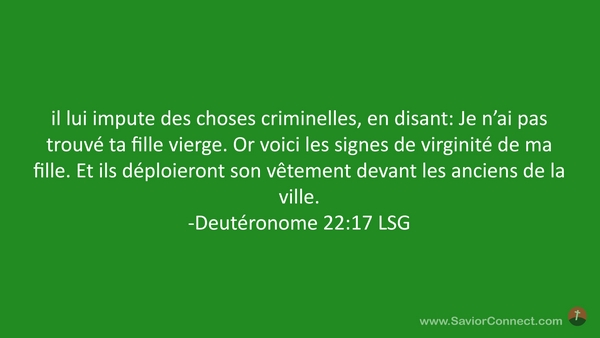 il lui impute des choses criminelles, en disant: Je n'ai pas trouvé ta fille vierge. Or voici les signes de virginité de ma fille. Et ils déploieront son vêtement devant les anciens de la ville. -Deutéronome 22:17 LSG