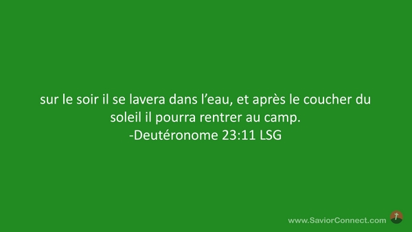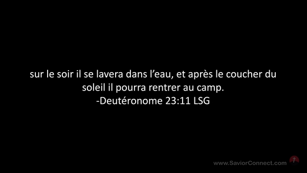 sur le soir il se lavera dans l'eau, et après le coucher du soleil il pourra rentrer au camp. -Deutéronome 23:11 LSG