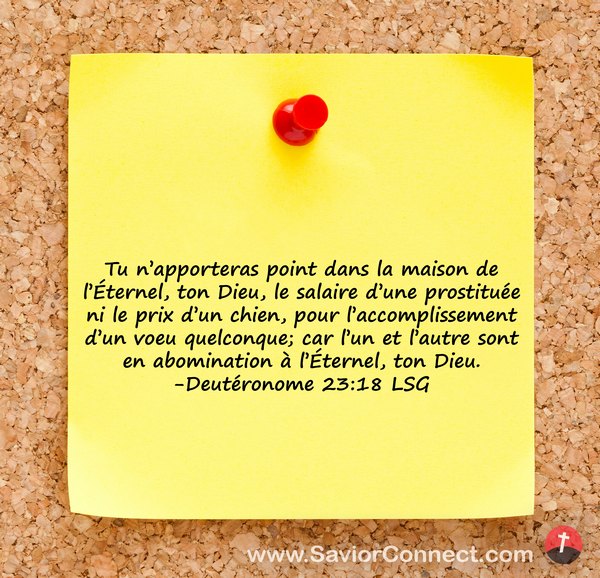 Tu n'apporteras point dans la maison de l'Éternel, ton Dieu, le salaire d'une prostituée ni le prix d'un chien, pour l'accomplissement d'un voeu quelconque; car l'un et l'autre sont en abomination à l'Éternel, ton Dieu. -Deutéronome 23:18 LSG