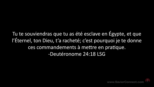 Tu te souviendras que tu as été esclave en Égypte, et que l'Éternel, ton Dieu, t'a racheté; c'est pourquoi je te donne ces commandements à mettre en pratique. -Deutéronome 24:18 LSG