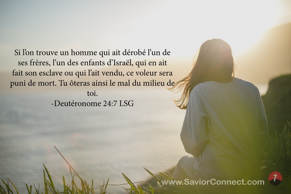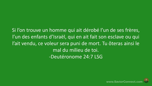 Si l'on trouve un homme qui ait dérobé l'un de ses frères, l'un des enfants d'Israël, qui en ait fait son esclave ou qui l'ait vendu, ce voleur sera puni de mort. Tu ôteras ainsi le mal du milieu de toi. -Deutéronome 24:7 LSG
