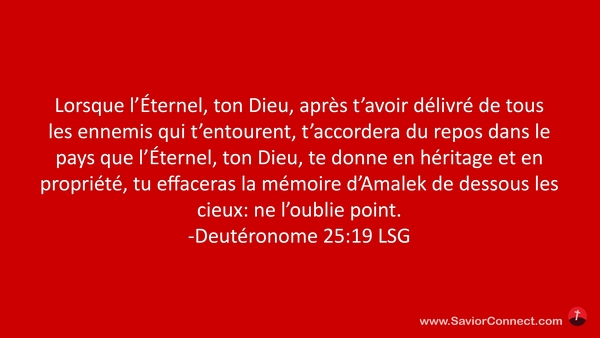Lorsque l'Éternel, ton Dieu, après t'avoir délivré de tous les ennemis qui t'entourent, t'accordera du repos dans le pays que l'Éternel, ton Dieu, te donne en héritage et en propriété, tu effaceras la mémoire d'Amalek de dessous les cieux: ne l'oublie point. -Deutéronome 25:19 LSG