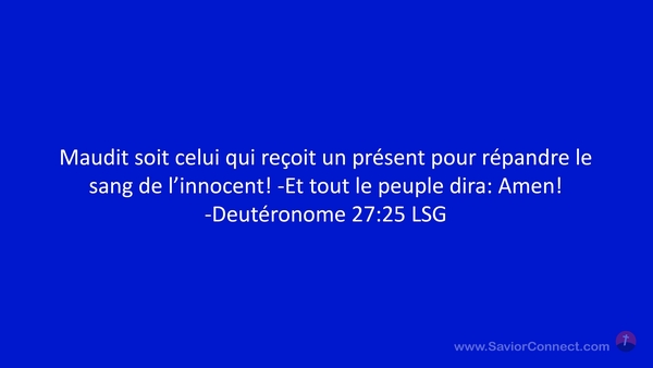Maudit soit celui qui reçoit un présent pour répandre le sang de l'innocent! -Et tout le peuple dira: Amen! -Deutéronome 27:25 LSG