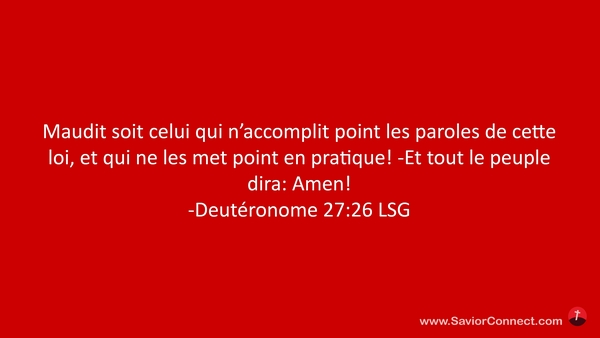 Maudit soit celui qui n'accomplit point les paroles de cette loi, et qui ne les met point en pratique! -Et tout le peuple dira: Amen! -Deutéronome 27:26 LSG
