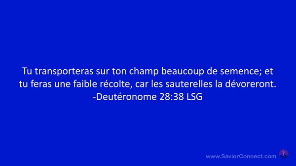 Tu transporteras sur ton champ beaucoup de semence; et tu feras une faible récolte, car les sauterelles la dévoreront. -Deutéronome 28:38 LSG