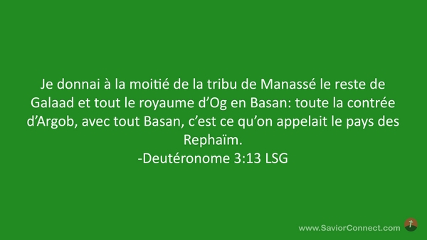 Je donnai à la moitié de la tribu de Manassé le reste de Galaad et tout le royaume d'Og en Basan: toute la contrée d'Argob, avec tout Basan, c'est ce qu'on appelait le pays des Rephaïm. -Deutéronome 3:13 LSG