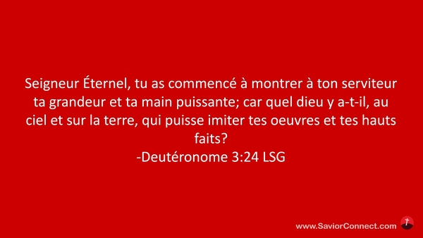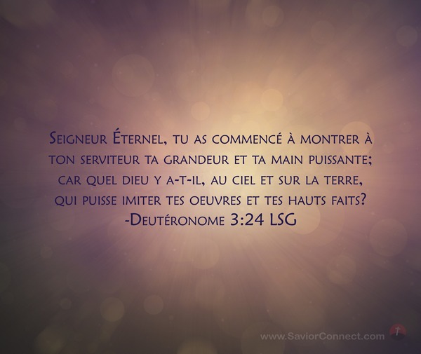 Seigneur Éternel, tu as commencé à montrer à ton serviteur ta grandeur et ta main puissante; car quel dieu y a-t-il, au ciel et sur la terre, qui puisse imiter tes oeuvres et tes hauts faits? -Deutéronome 3:24 LSG