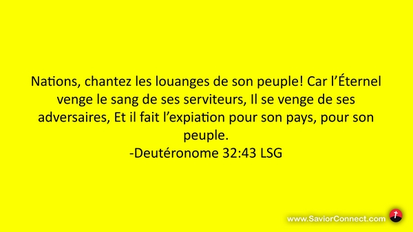 Nations, chantez les louanges de son peuple! Car l'Éternel venge le sang de ses serviteurs, Il se venge de ses adversaires, Et il fait l'expiation pour son pays, pour son peuple. -Deutéronome 32:43 LSG