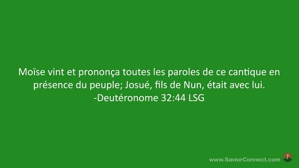 Moïse vint et prononça toutes les paroles de ce cantique en présence du peuple; Josué, fils de Nun, était avec lui. -Deutéronome 32:44 LSG
