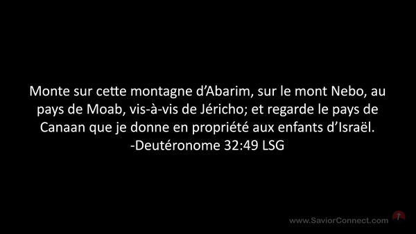 Monte sur cette montagne d'Abarim, sur le mont Nebo, au pays de Moab, vis-à-vis de Jéricho; et regarde le pays de Canaan que je donne en propriété aux enfants d'Israël. -Deutéronome 32:49 LSG