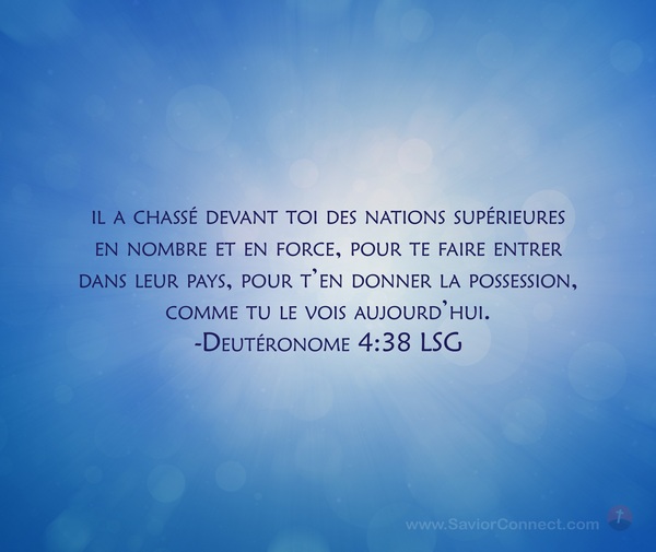 il a chassé devant toi des nations supérieures en nombre et en force, pour te faire entrer dans leur pays, pour t'en donner la possession, comme tu le vois aujourd'hui. -Deutéronome 4:38 LSG