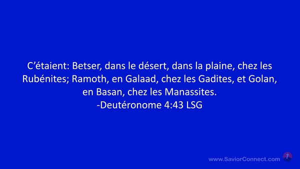 C'étaient: Betser, dans le désert, dans la plaine, chez les Rubénites; Ramoth, en Galaad, chez les Gadites, et Golan, en Basan, chez les Manassites. -Deutéronome 4:43 LSG