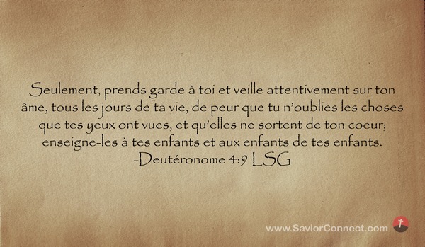 Seulement, prends garde à toi et veille attentivement sur ton âme, tous les jours de ta vie, de peur que tu n'oublies les choses que tes yeux ont vues, et qu'elles ne sortent de ton coeur; enseigne-les à tes enfants et aux enfants de tes enfants. -Deutéronome 4:9 LSG