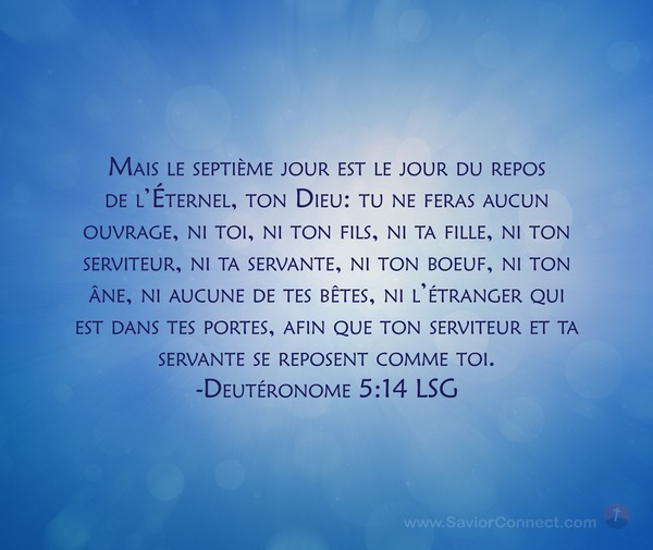 Mais le septième jour est le jour du repos de l'Éternel, ton Dieu: tu ne feras aucun ouvrage, ni toi, ni ton fils, ni ta fille, ni ton serviteur, ni ta servante, ni ton boeuf, ni ton âne, ni aucune de tes bêtes, ni l'étranger qui est dans tes portes, afin que ton serviteur et ta servante se reposent comme toi. -Deutéronome 5:14 LSG