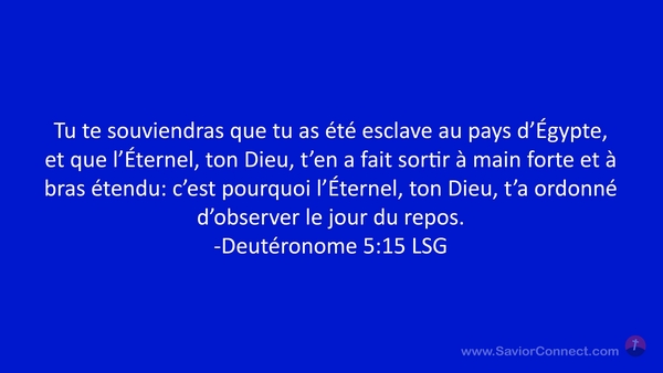 Tu te souviendras que tu as été esclave au pays d'Égypte, et que l'Éternel, ton Dieu, t'en a fait sortir à main forte et à bras étendu: c'est pourquoi l'Éternel, ton Dieu, t'a ordonné d'observer le jour du repos. -Deutéronome 5:15 LSG