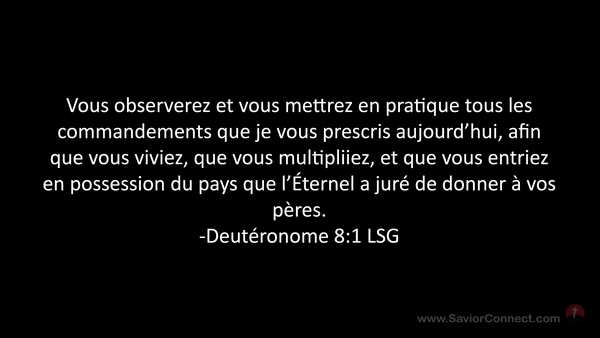 Vous observerez et vous mettrez en pratique tous les commandements que je vous prescris aujourd'hui, afin que vous viviez, que vous multipliiez, et que vous entriez en possession du pays que l'Éternel a juré de donner à vos pères. -Deutéronome 8:1 LSG