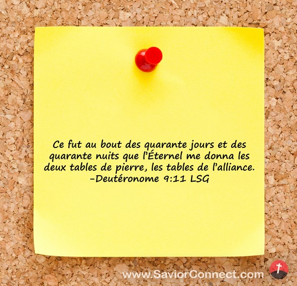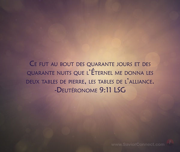 Ce fut au bout des quarante jours et des quarante nuits que l'Éternel me donna les deux tables de pierre, les tables de l'alliance. -Deutéronome 9:11 LSG