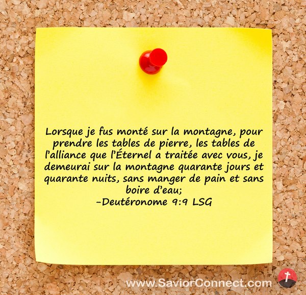 Lorsque je fus monté sur la montagne, pour prendre les tables de pierre, les tables de l'alliance que l'Éternel a traitée avec vous, je demeurai sur la montagne quarante jours et quarante nuits, sans manger de pain et sans boire d'eau; -Deutéronome 9:9 LSG